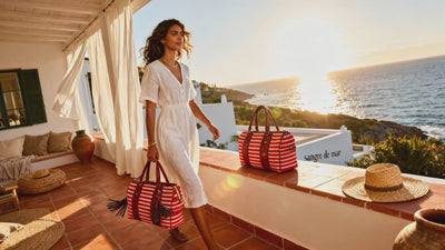 Timeless weekender silhouette inspired by coastal living. The rich tobacco hue contrasts elegantly with the red-and-white stripes for a refined yet relaxed look.
